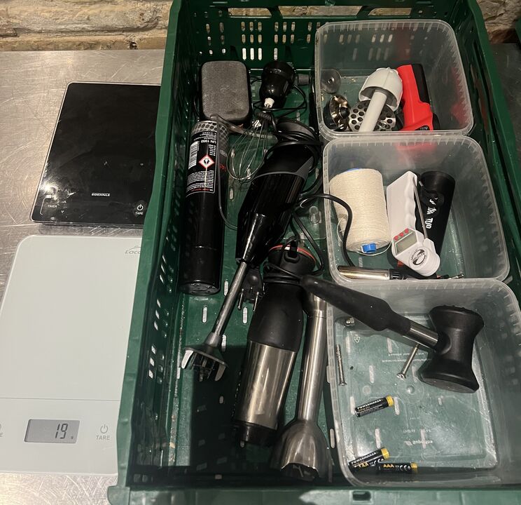 A7998 LA-187 - Kasse med blandet køkkenudstyr, stavblændere, vægte mv.