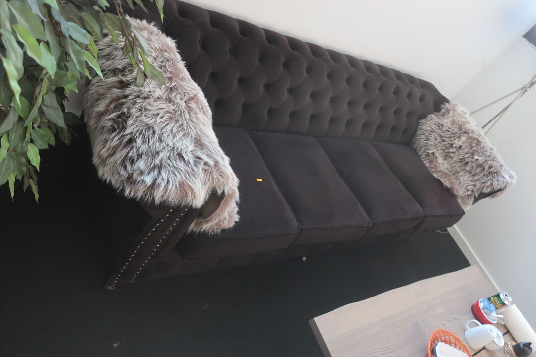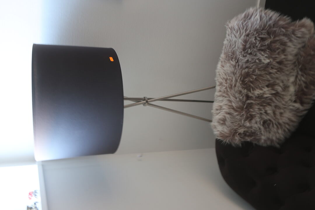 Sofa, sofabord og lampe