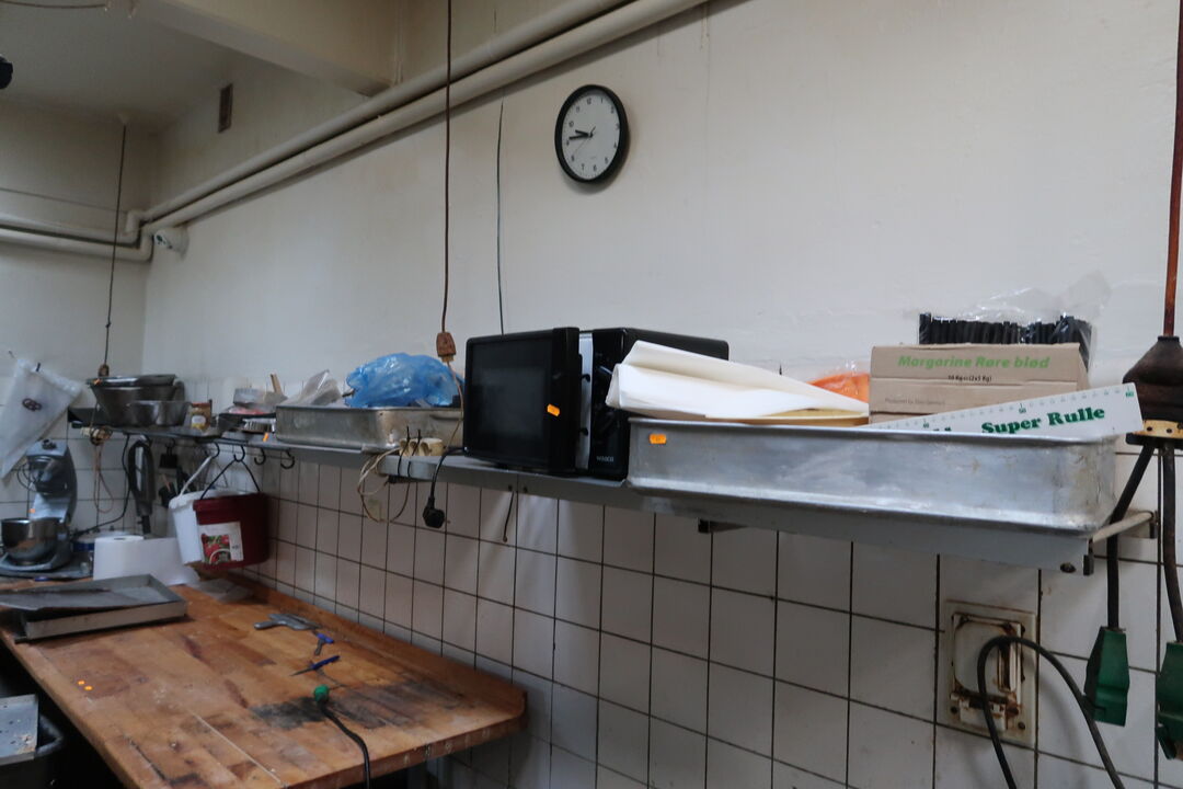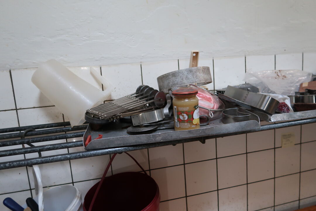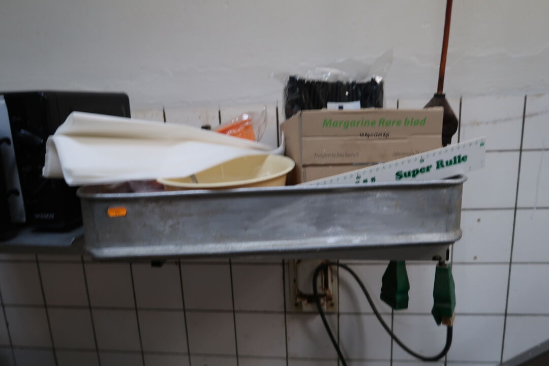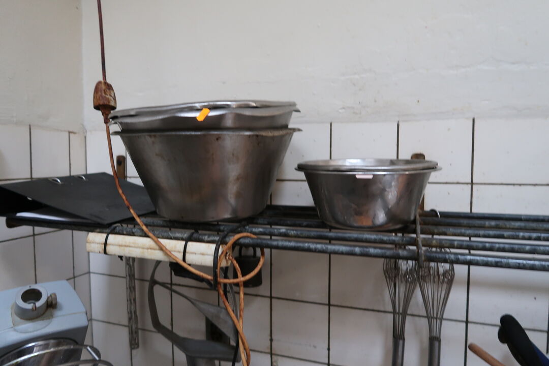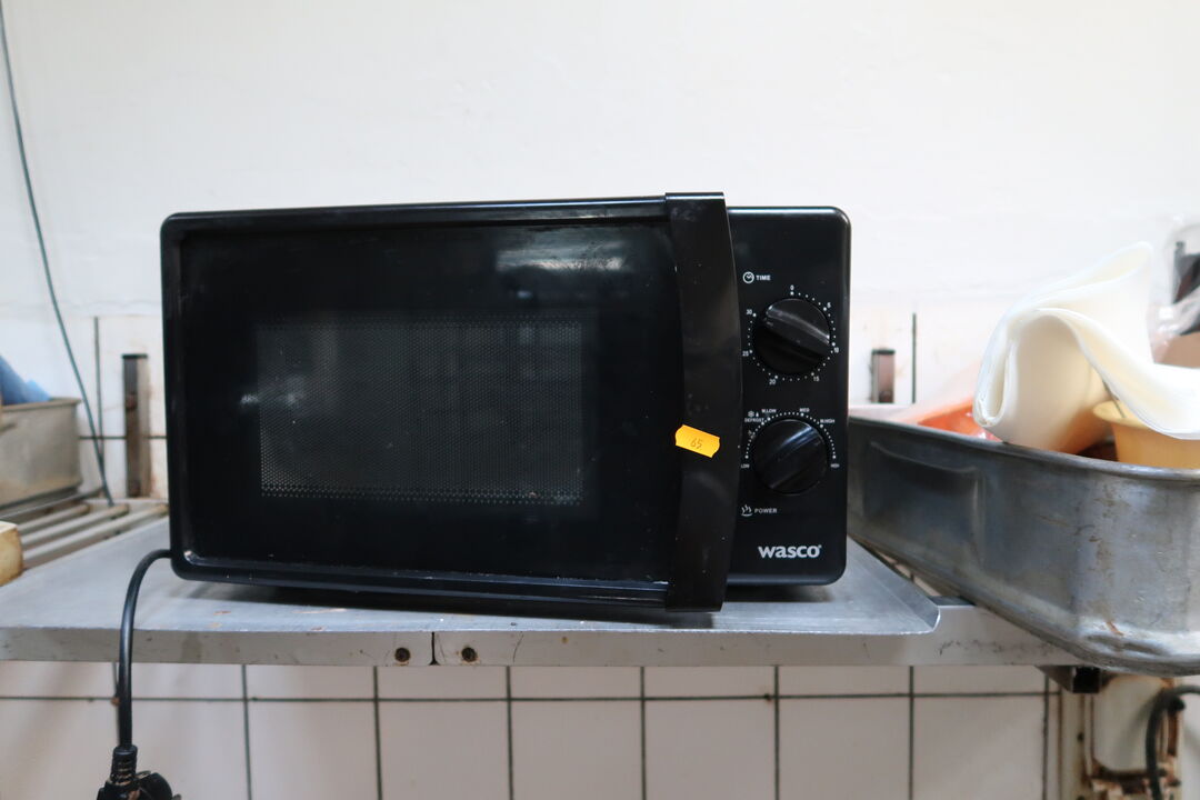 A8548 L65 - Opbevaringsreol med mikrobølgeovn, rustfri skåle, div. køkkenredskaber m.m.